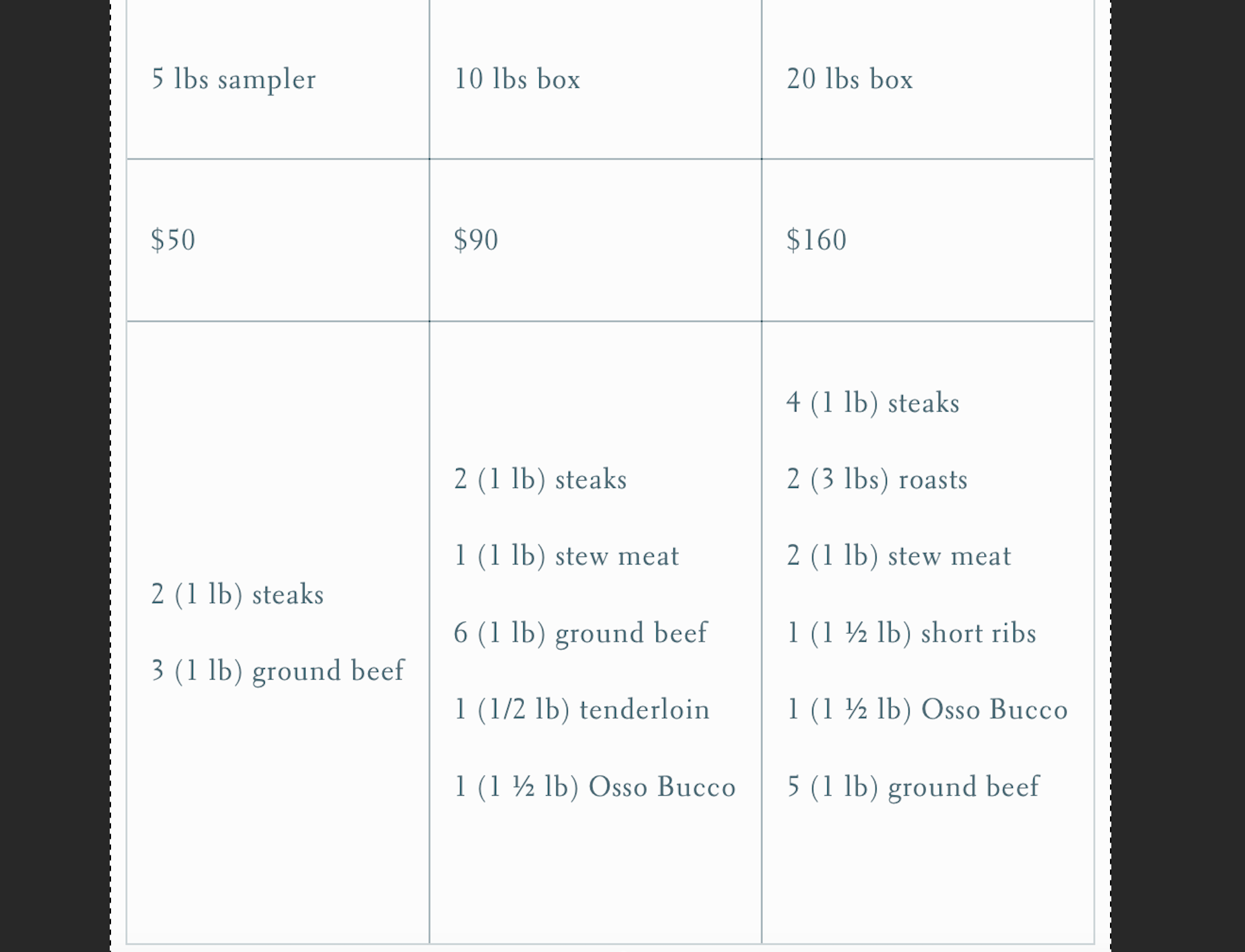 You have the option to buy a portion or all of an animal, and the cuts include meat from the entire animal.