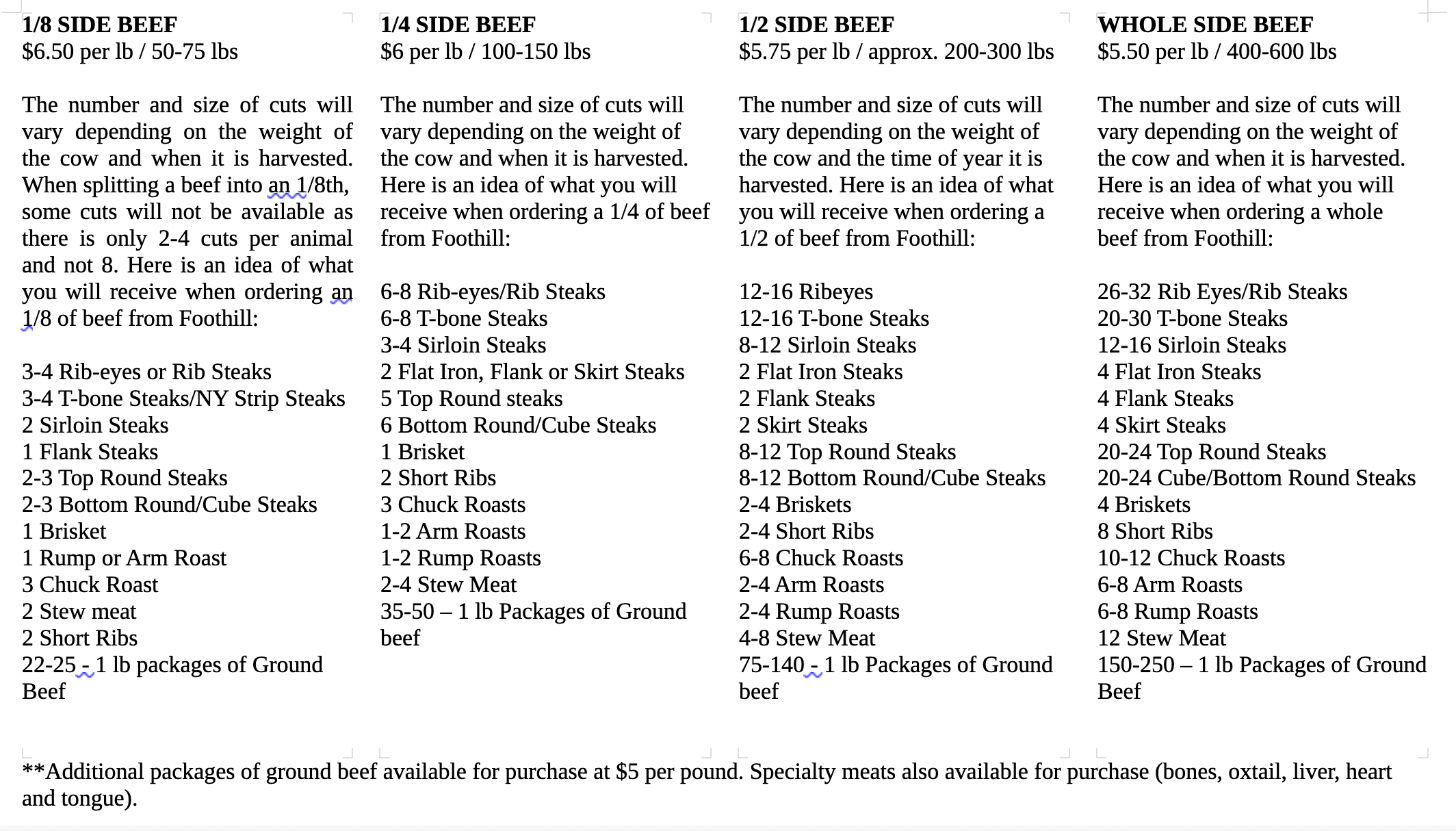 The final price of your beef share is determined by the final hanging weight.The number and size of cuts will vary depending on the weight of the cow and when it is harvested. In addition to shares of beef, we also sell ground beef (1, 5 and 10 lbs boxes), beef tallow, pork lard, organ meat and bones.